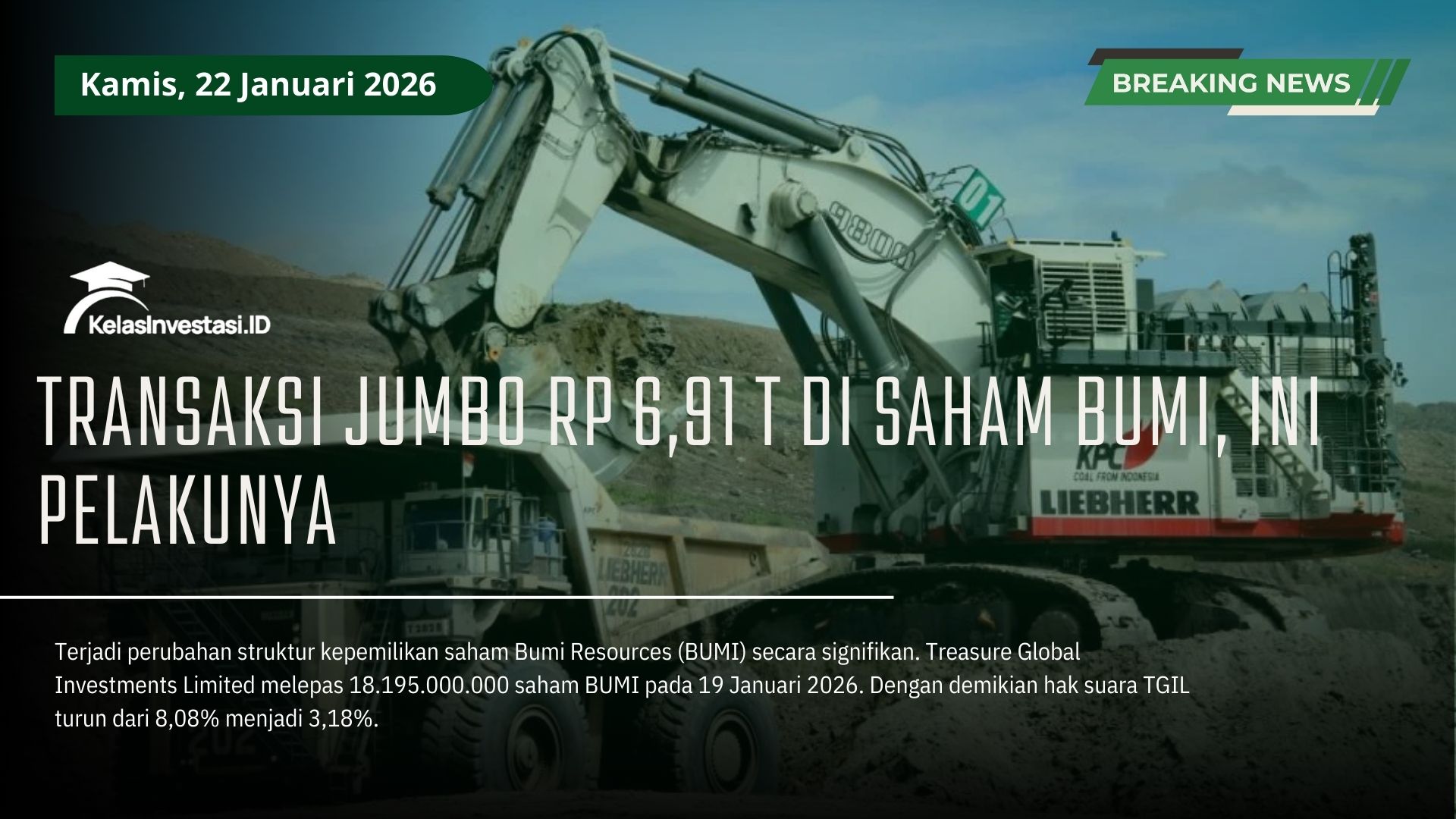 Terjadi perubahan struktur kepemilikan saham Bumi Resources (BUMI) secara signifikan. Treasure Global Investments Limited melepas 18.195.000.000 saham BUMI pada 19 Januari 2026.