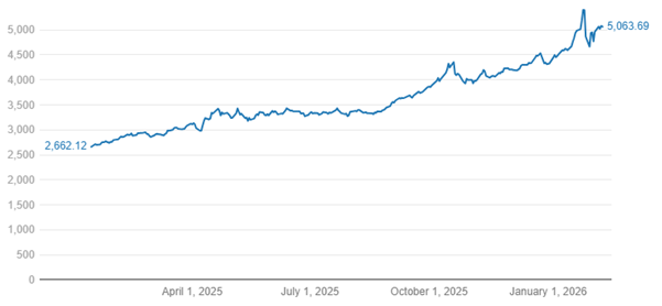 Pada perdagangan Kamis (12/2/2026), harga emas dunia anjlok 3,13% di level US$4.919,69 per troy ons. Penurunan tersebut membawa emas ke harga terendah seminggu dan mendorong emas menjauh dari level psikologis US$5.000 per troy ons.