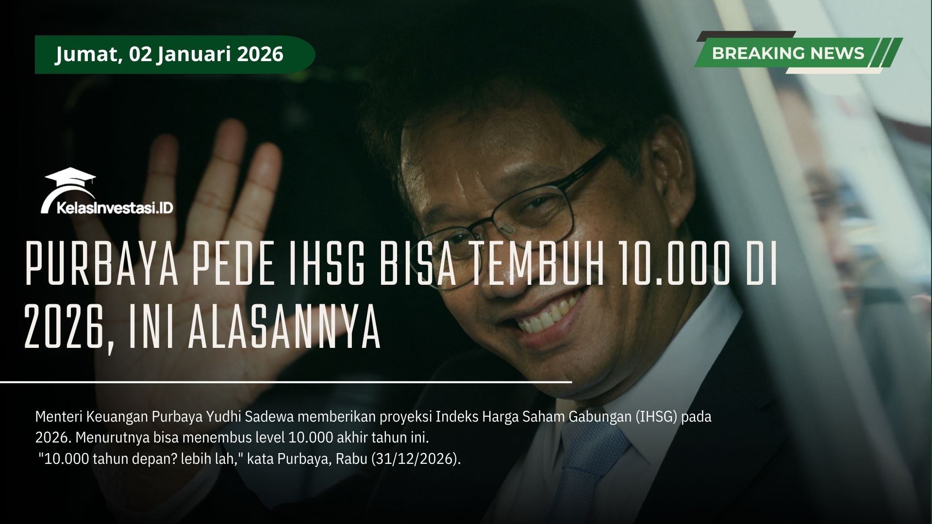 Menteri Keuangan Purbaya Yudhi Sadewa memberikan proyeksi Indeks Harga Saham Gabungan (IHSG) pada 2026. Menurutnya bisa menembus level 10.000 akhir tahun ini.“10.000 tahun depan? lebih