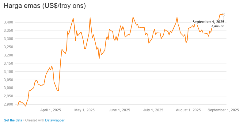Pada perdagangan hari ini Senin (1/9/2025) hingga pukul 06.29 WIB, harga emas dunia di pasar spot melemah 0,01% di posisi US$3446,38 per troy ons.