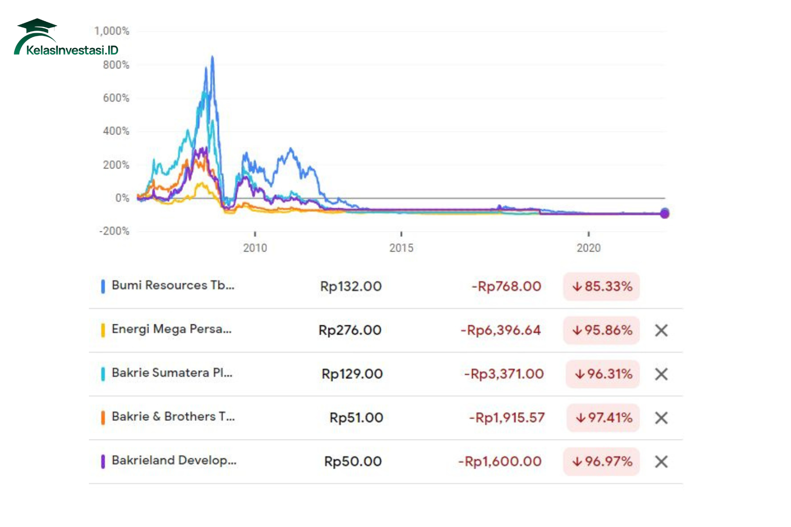 Saham-saham yang tergabung dalam Grup Bakrie semakin menarik perhatian pasar. Sepanjang tahun ini, emiten yang terafiliasi dengan keluarga Bakrie mayoritas mencatatkan kenaikan saham signifikan. Pada penutupan perdagangan Rabu (20/11), saham Bumi Resources Minerals Tbk (BRMS) mencatat lonjakan 155,29% secara year to date (ytd), diikuti oleh PT Darma Henwa Tbk (DEWA) yang meningkat 103,33% ytd dan PT Bumi Resources Tbk (BUMI) yang naik 72,94% ytd.PT Bakrie Sumatera Plantations Tbk (UNSP) naik 15,04% ytd.