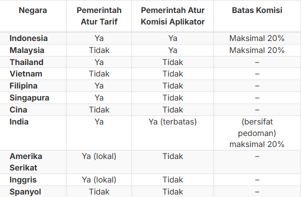 Malaysia mengatur besaran komisi maksimal 20% lewat E-hailing Services Guidelines 2018. Sedangkan di India, Motor Vehicle Aggregator Guidelines menyebutkan bahwa pengemudi harus menerima setidaknya 80% dari tarif pada setiap perjalanan, sebagaimana dikutip dari The Indian Express.