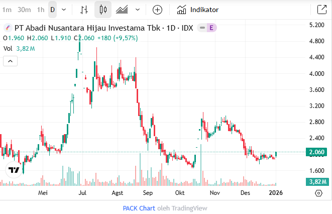 PT Abadi Nusantara Hijau Investama Tbk (PACK) menawarkan sebanyak 32.586.939.356 Obligasi Wajib Konversi (OWK) melalui skema rights issue atau penambahan modal dengan memberikan hak memesan efek terlebih dahulu I (PMHMETD I). Perseroan mematok harga pelaksanaan sebesar Rp100 per saham, sehingga dana yang akan terhimpun sejumlah Rp3,2 triliun.