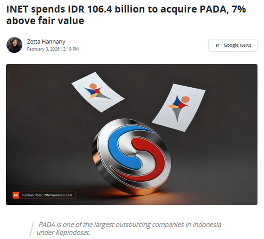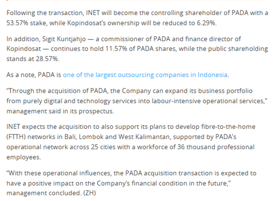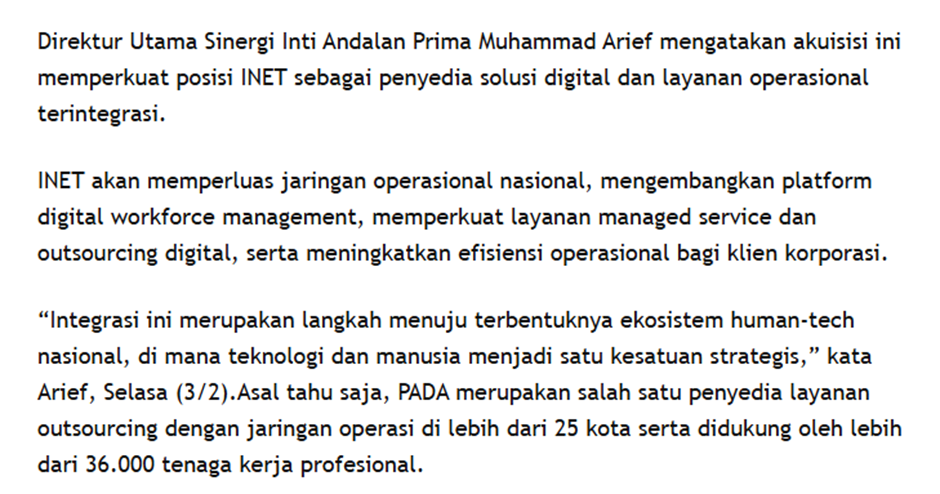 Kenapa INET membeli PADA? Jawabannya : INET membeli kapasitas eksekusi. Akuisisi 53,57% PADA oleh INET dijelaskan sbg langkah untuk mengintegrasikan layanan digital & teknologi INET dgn kemampuan outsourcing & SDM skala besar milik PADA, termasuk telecommunications maintenance, call center, security, dan logistics.