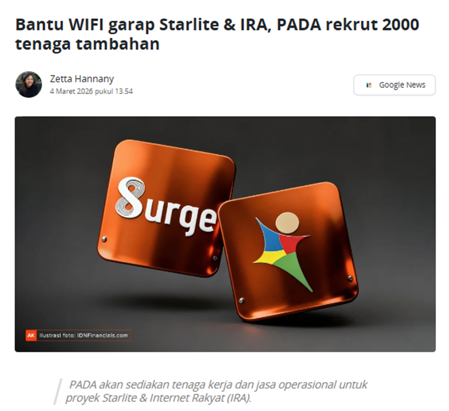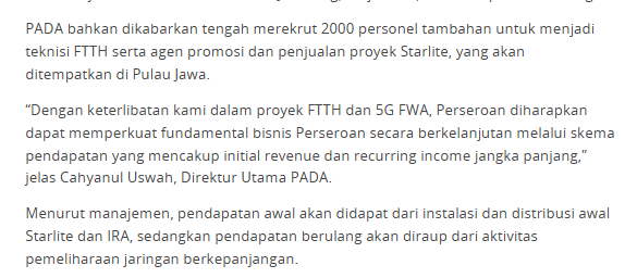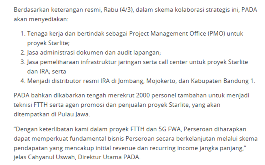 Lalu ketika PADA masuk ke proyek WIFI seperti Starlite dan Internet Rakyat (IRA), posisinya makin jelas : dia dipakai untuk mengeksekusi rollout di lapangan, bukan cm jadi vendor tambahan.