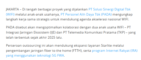 Kenapa lalu nyambung ke WIFI? Setelah INET jadi pengendali PADA, fungsi PADA makin naik kelas karena masuk ke proyek WIFI. Pada Maret 2026, PADA mengumumkan kerja sama strategis untuk mendukung agenda akselerasi WIFI melalui dua anak usahanya, IJE dan TKP.