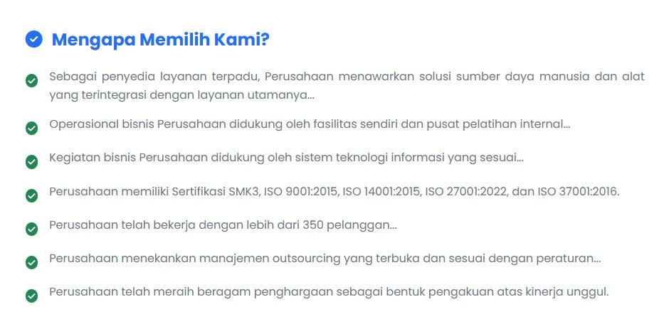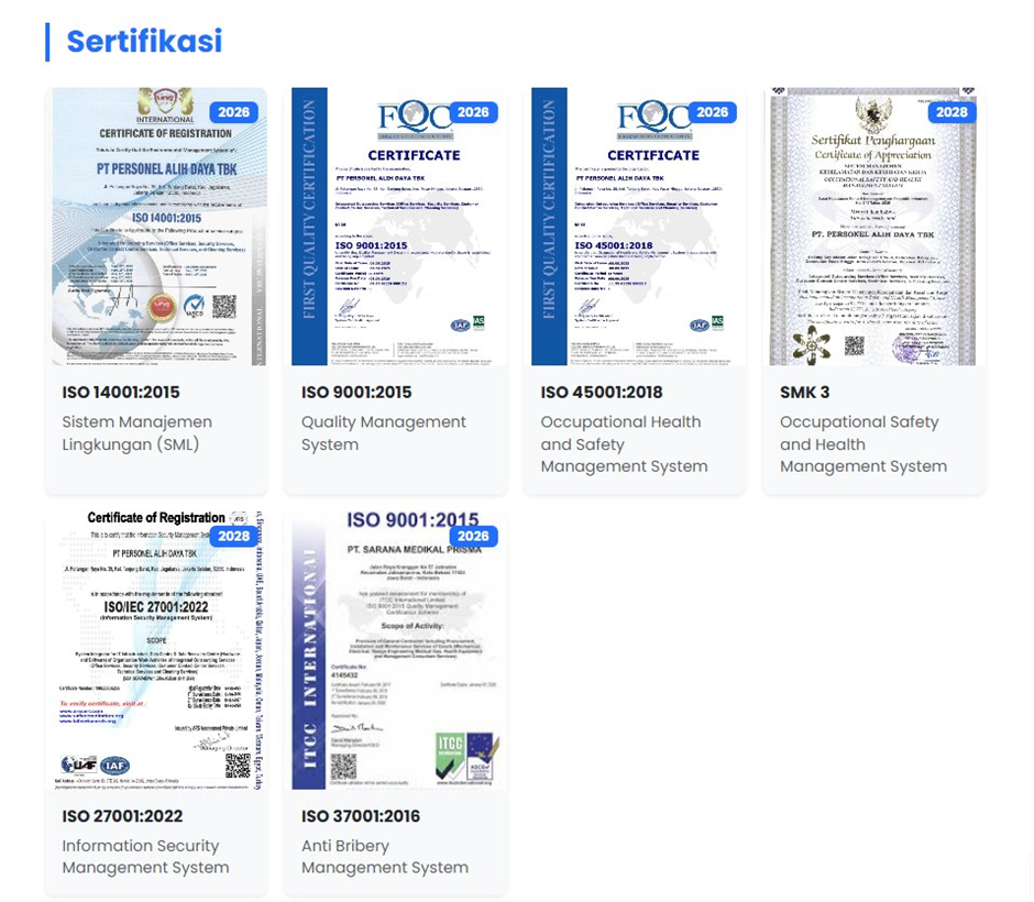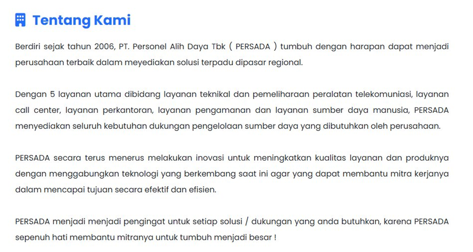Di profil resminya, Persada juga menyebut didukung fasilitas sendiri, training center internal, sistem IT operasional, sertifikasi ISO/SMK3, serta basis klien yang besar.