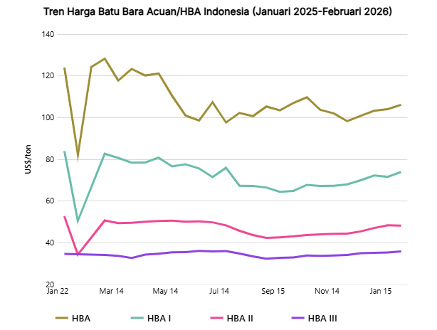Berdasarkan catatan Katadata, tren HBA fluktuatif namun cenderung menurun di sepanjang 2025. Pada Januari tahun lalu, harganya sebesar US$ 124,01 per ton, namun turun menjadi US$ 100,81 per ton pada akhir Desember 2025.
