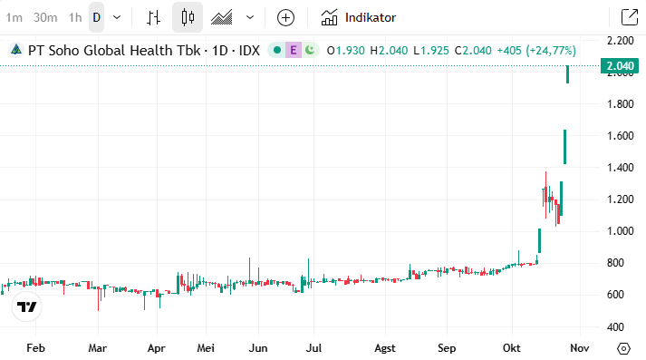 Secara kronologis, saham SOHO secara bertahap bergerak dari level 815 per saham menuju 1.635 per saham sepanjang periode 13–27 Oktober 2025 dan sempat terkoreksi ke level 1.050 per saham pada 23 Oktober 2025.