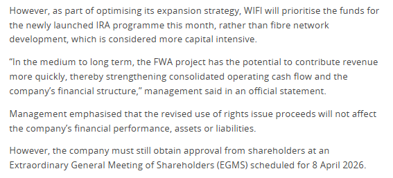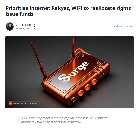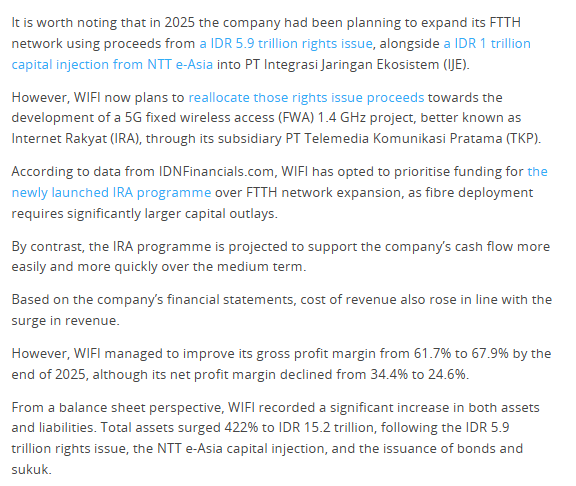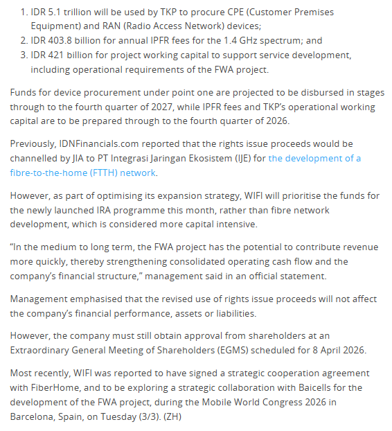 WIFI bahkan mengalihkan dana rights issue Rp5,89 triliun ke proyek FWA, dgn alokasi sekitar Rp5,1 triliun buat perangkat CPE dan RAN, Rp403,8 miliar buat biaya frekuensi 1,4 GHz, & Rp421 miliar buat modal kerja.