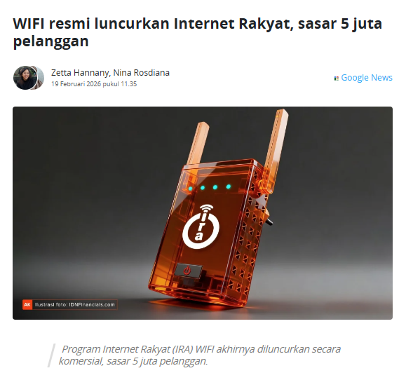 IRA resmi mulai komersial pada 19 Februari 2026. Paketnya dipasang Rp100 ribu untuk kecepatan sampai 100 Mbps, dan perusahaan menargetkan lebih dari 5 juta pelanggan dengan 5.500 site aktif pada 2026 di Jawa, Maluku, dan Papua.
