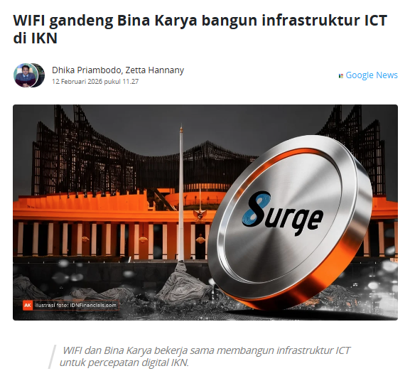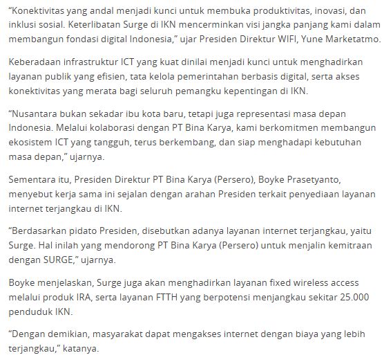 Ada tambahan cerita lain yg bikin WIFI makin sering dibahas, yaitu IKN. WIFI kerja sama dgn Bina Karya untuk bantu perencanaan, pembangunan, & pengembangan infrastruktur ICT di IKN, termasuk serat optik, broadband, & sistem konektivitas terintegrasi.