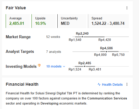 Kalau masuk ke valuasi, di sinilah ceritanya mulai lebih rumit. Per 1 April 2026, WIFI ada di sekitar Rp2.250. Di sisi lain, data Investing menampilkan rata-rata target analis sekitar Rp4.586, dengan range Rp4.000 sampai Rp5.750.