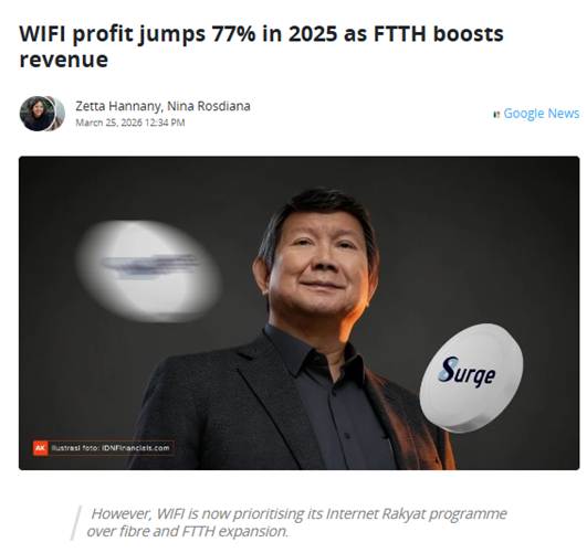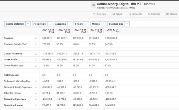 Dari sisi angka, 2025 WIFI memang bukan cuma jual mimpi. Laba bersih 2025 naik 76,9% jadi sekitar Rp408,5 miliar, sementara pendapatan naik 147% jadi sekitar Rp1,7 triliun.